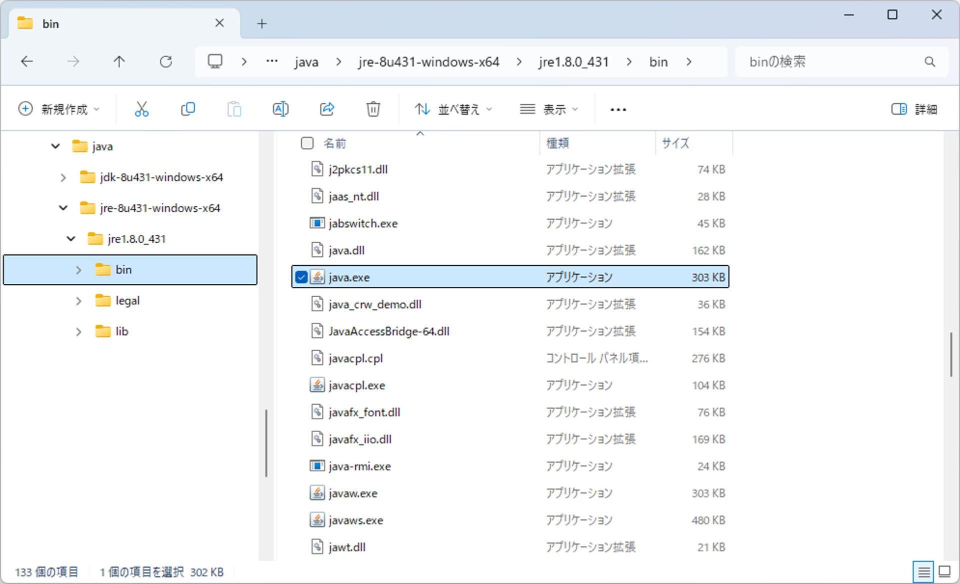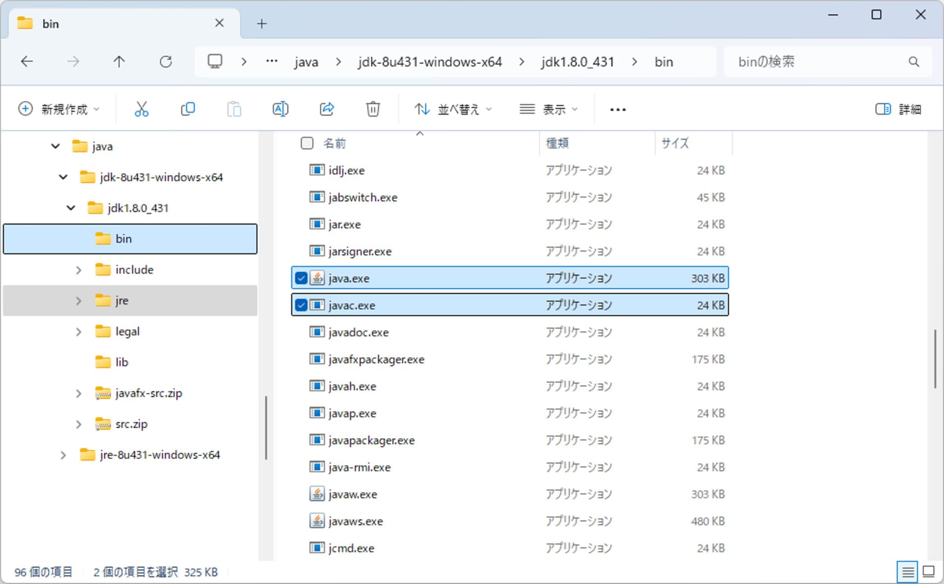 ダウンロードした .zip を展開して内容を確認すると、JDKの bin ディレクトリには java.exe のほか開発に必要な javac.exe 等が含まれていたり、JRE自体が含まれていたりすることが分かります。